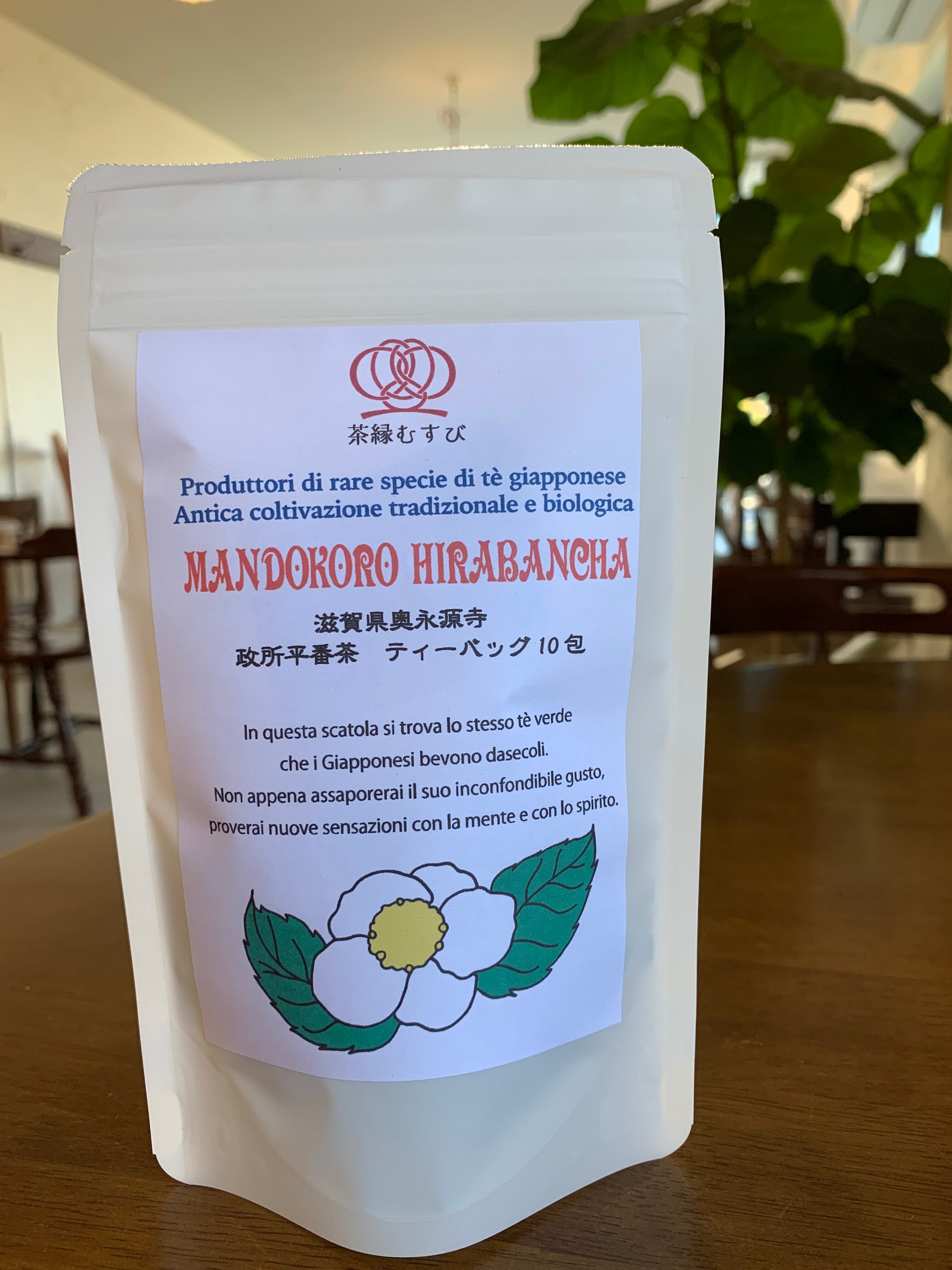 滋賀県東近江市奥永源寺地域で無農薬・有機栽培された政所茶「平番茶」のティーバッグ10包入り。カッフェビアンコのブランドを表現するために「イタリアの片田舎のお菓子屋」をイメージしたパッケージにしました。